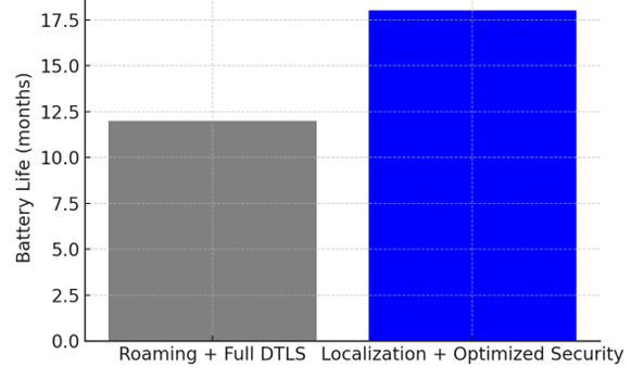 Security adds overhead, but the right architecture ensures it does not come at the expense of device longevity. For constrained devices, full DTLS handshakes with certificate exchange can require several kilobytes of data and multiple round trips. This can translate to energy costs of 500–800 mJ per handshake, depending on radio conditions.