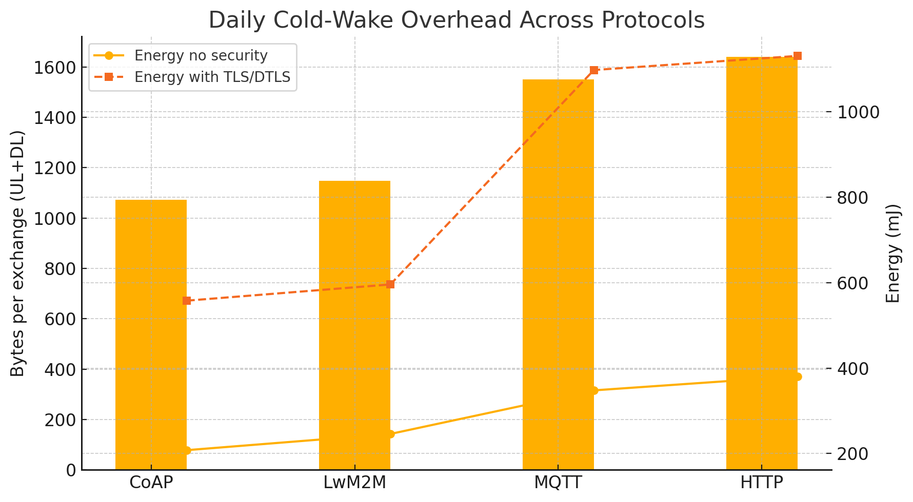 The graph reveals a striking pattern: encryption doesn't just add a flat cost — it compounds the existing inefficiencies of heavier protocols. For CoAP, the most frugal protocol at ~1,075 bytes per exchange, adding DTLS nearly 6x the energy consumption (jumping from ~100mJ to ~600mJ). LwM2M tells a similar story, as it rides atop CoAP and inherits comparable byte overhead (~1,150 bytes) with only a modest energy penalty without security — but DTLS handshake costs push it into the same ~600mJ range. The critical takeaway here is that even the lightest protocols lose their efficiency advantage the moment you introduce a security handshake, because the handshake itself — certificate exchange, key negotiation, cipher suite agreement — dwarfs the actual application payload in both bytes and CPU cycles on constrained hardware.